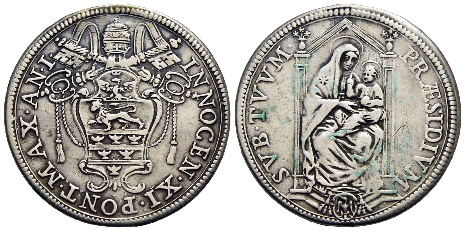 ROMA - Innocenzo XI (1676-1689) - Testone - A. I - Stemma oblungo sagomato - R/ La Madonna in trono con il Bambino - (AG g. 9,13) RR CNI 14; Munt. 60