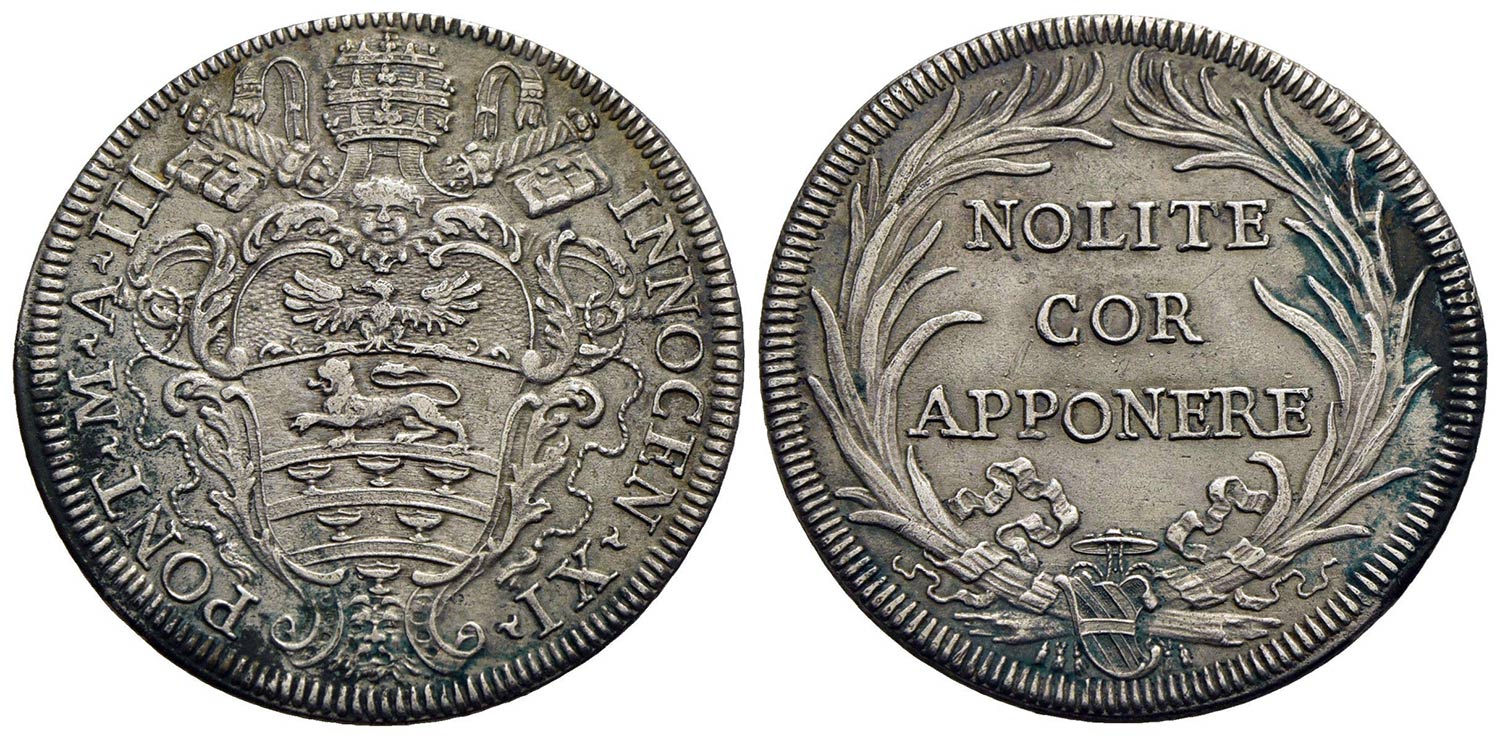 ROMA - Innocenzo XI (1676-1689) - Testone - A. III - Stemma ovale sagomato - R/ Scritta in tre righe in corona di palma chiusa - (AG g. 9,44) RRR CNI 26; Munt. 56