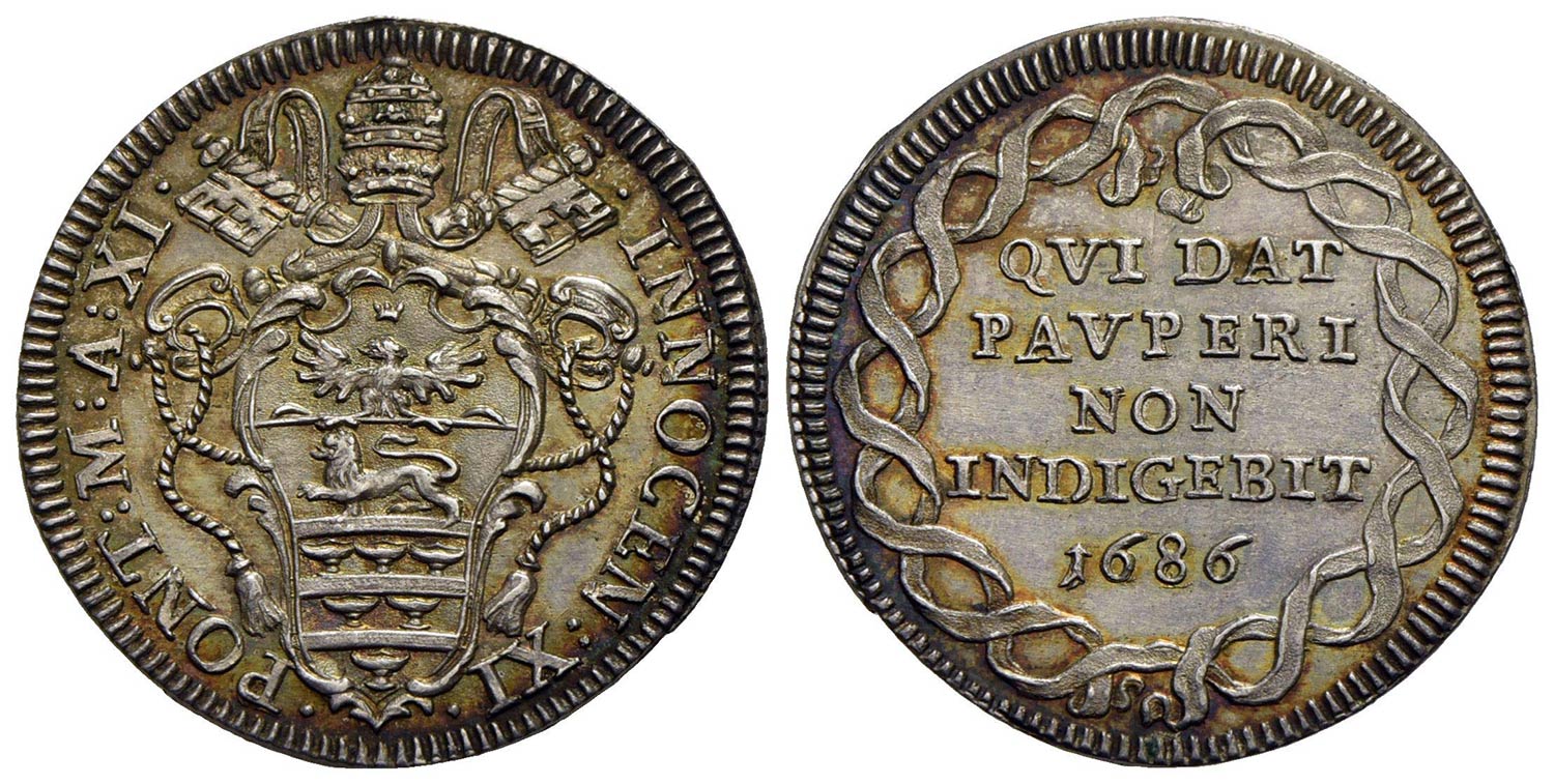 ROMA - Innocenzo XI (1676-1689) - Giulio - 1686 A. XI - Stemma ovale sagomato - R/ Scritta in cerchio di nastri attorcigliati - (AG g. 3,06) R CNI 141; Munt. 165 Patinata - Sicuramente tra i migliori esemplari che ci sia capitato di osservare, con i rilievi dello stemma perfettamente nitidi
