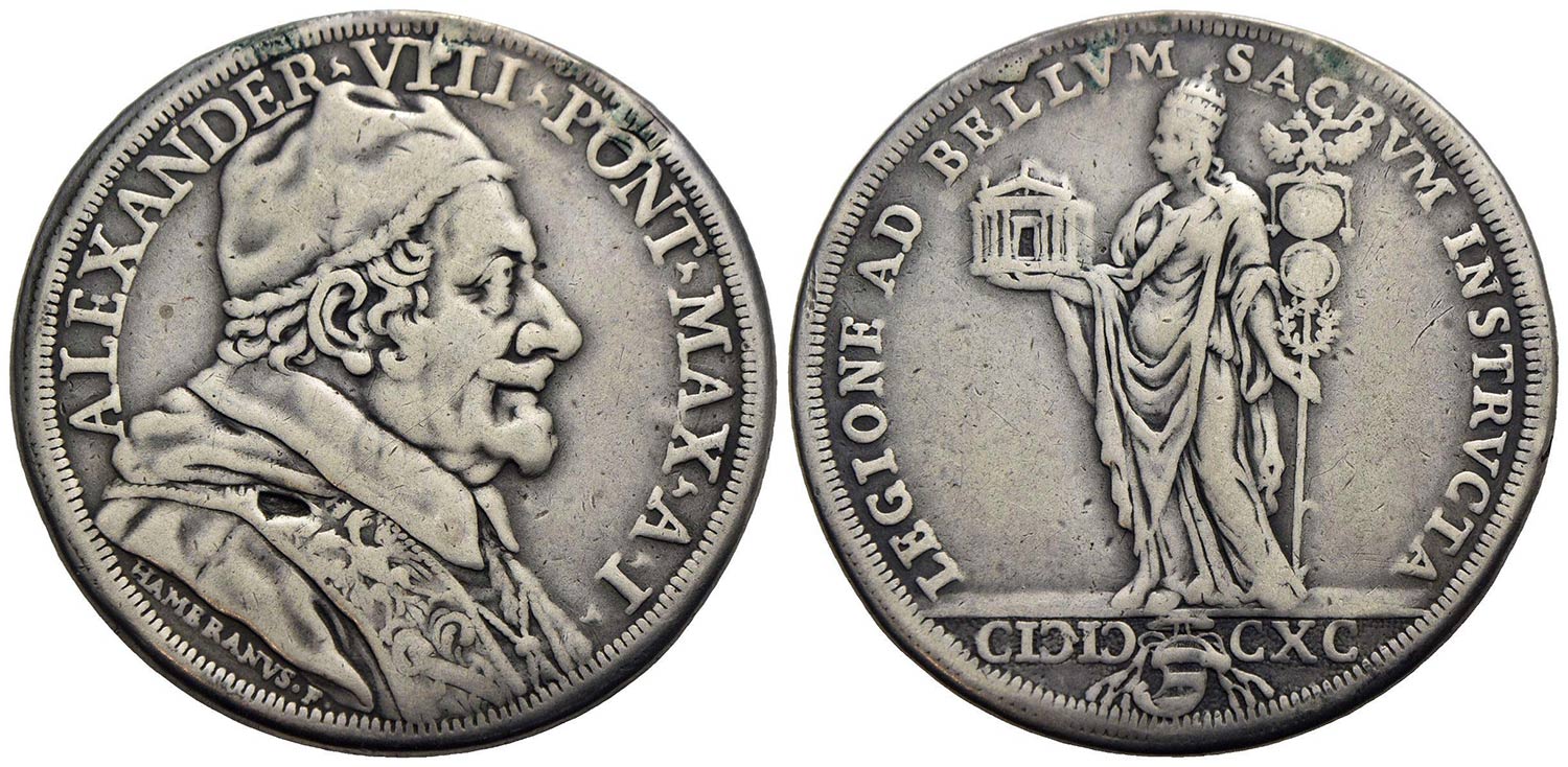 ROMA - Alessandro VIII (1689-1691) - Piastra - 1690 A. I - Busto con camauro a d. - R/ Figura della Chiesa a s. con insegna legionaria nella s. - (AG g. 31,08) R CNI 26; Munt. 11 Montatura rimossa