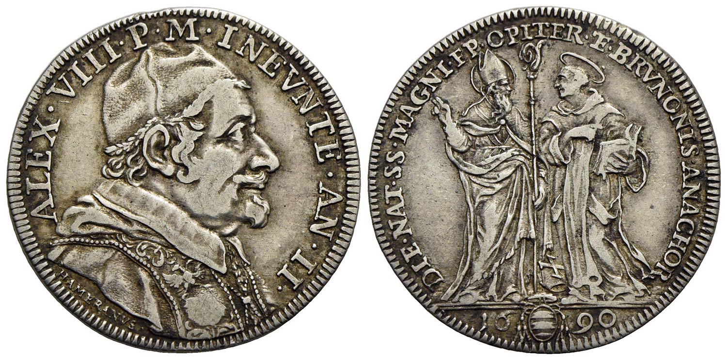 ROMA - Alessandro VIII (1689-1691) - Testone - A. II - Busto con camauro a d. - R/ San Magno e San Brunone stanti di fronte; all'esergo armetta Patrizi - (AG g. 9,13) R CNI 41; Munt. 15