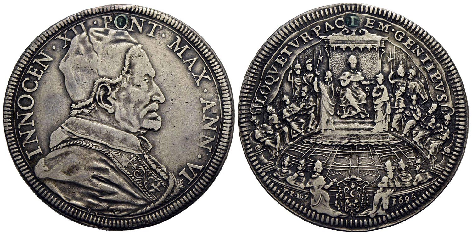 ROMA - Innocenzo XII (1691-1700) - Piastra - 1696 A. VI - Busto a d. con camauro - R/ Il Papa in con