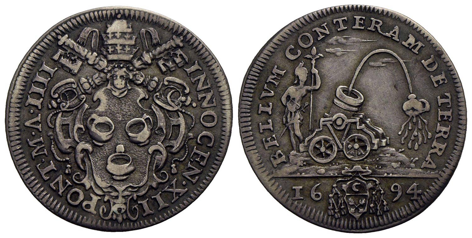 ROMA - Innocenzo XII (1691-1700) - Giulio - 1694 A. IIII - Stemma ovale sagomato in cornice - R/ Artigliere che spara una bombarda - (AG g. 2,93) RR CNI 56; Munt. 54 Patinata