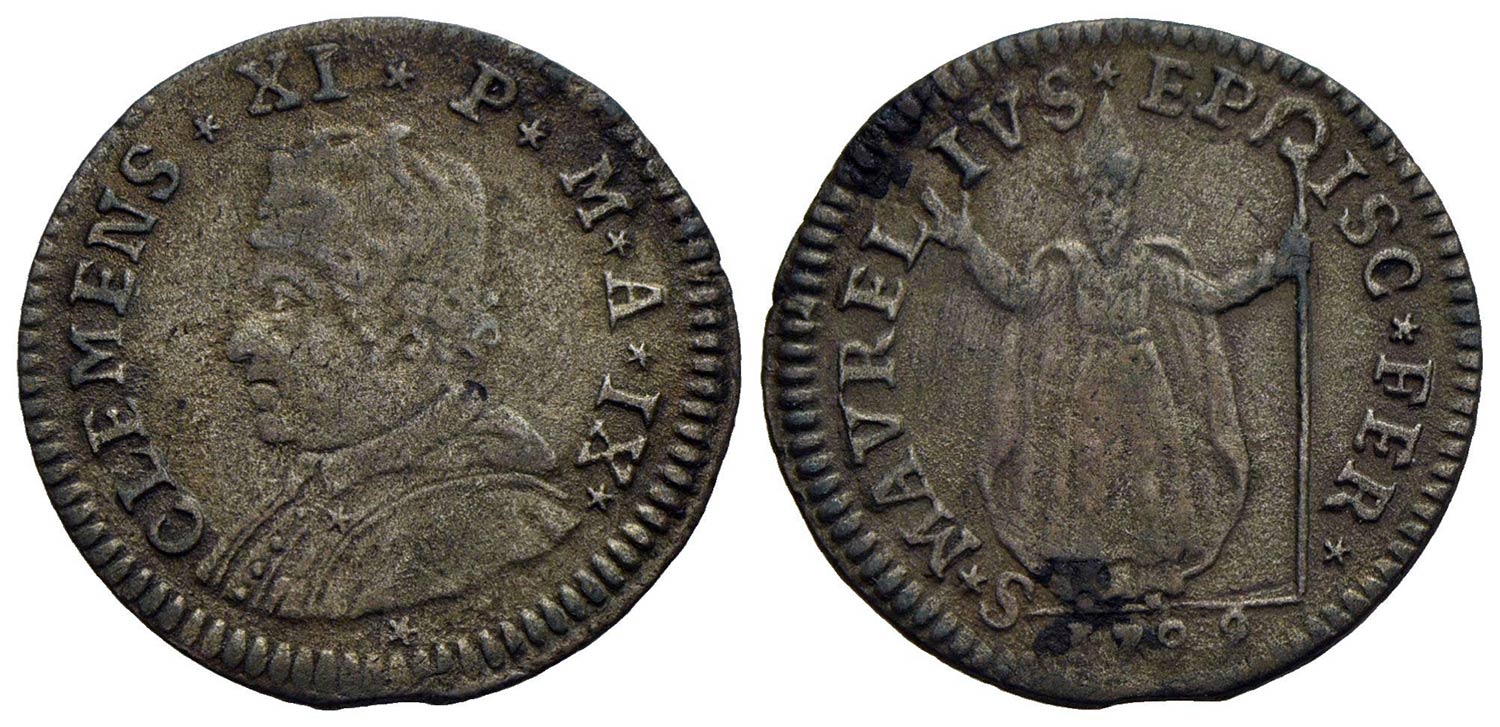 FERRARA - Clemente XI (1700-1721) - Muraiola da 4 baiocchi - 1709 A. X - Busto a s. con camauro - R/ Figura del Santo con le braccia allargate - (MI g. 2,89) R CNI 41; Munt. 240c