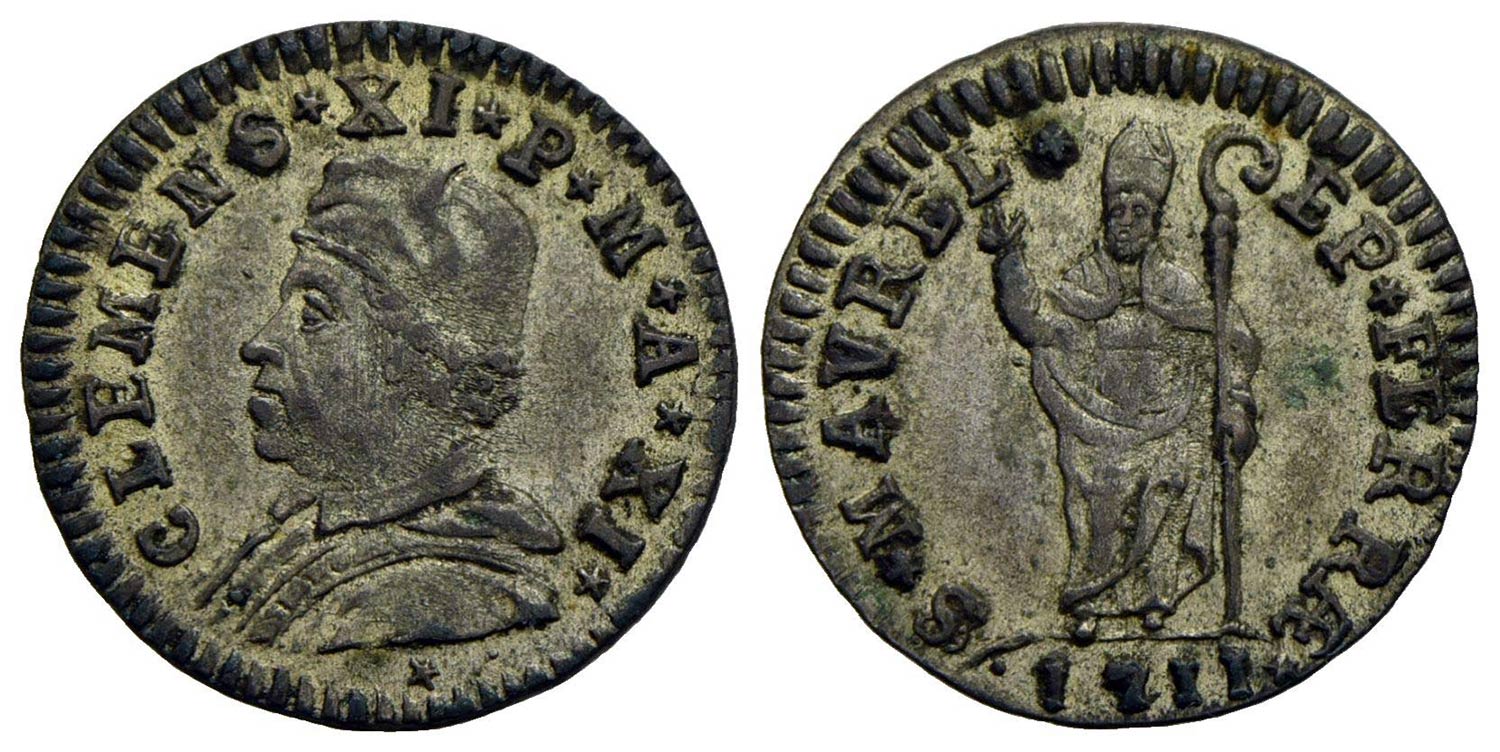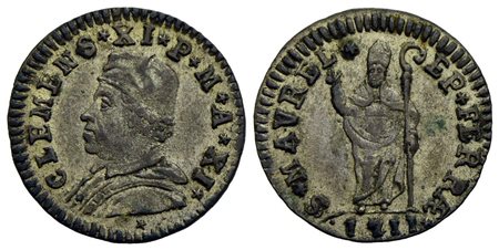 FERRARA - Clemente XI (1700-1721) - Muraiola da 2 baiocchi - 1711 A. XI - Busto a s. - R/ Figura del Santo - (MI g. 1,47) R CNI 73; Munt. 247a Conservazione notevole per il tipo