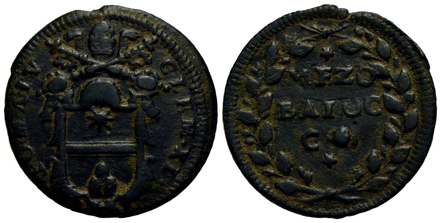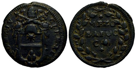 GUBBIO - Clemente XI (1700-1721) - Mezzo baiocco - A. IV - Stemma semiovale in cornice - R/ Scritta - (CU g. 8,21) RR Ser. 317; Munt. 254