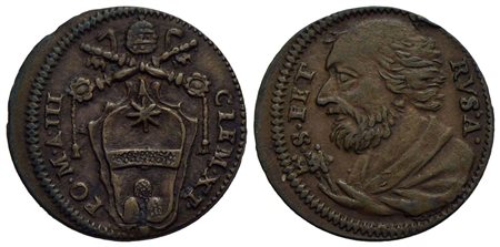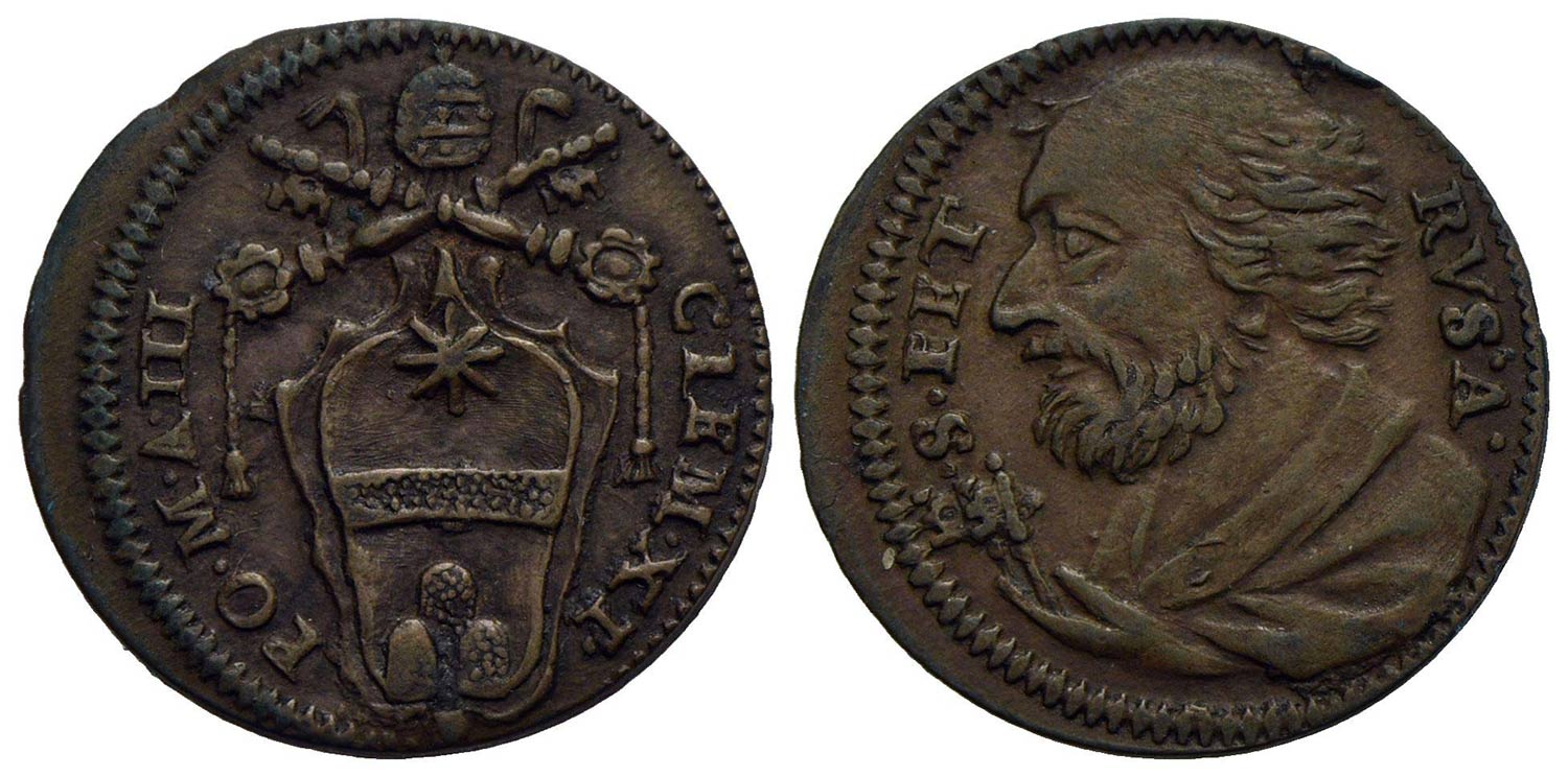 GUBBIO - Clemente XI (1700-1721) - Quattrino - A. III - Stemma ovale in cornice poligonale - R/ Busto del Santo a s. - (CU g. 3,56) RR Munt. 279 al D/; Munt. 282 al R/