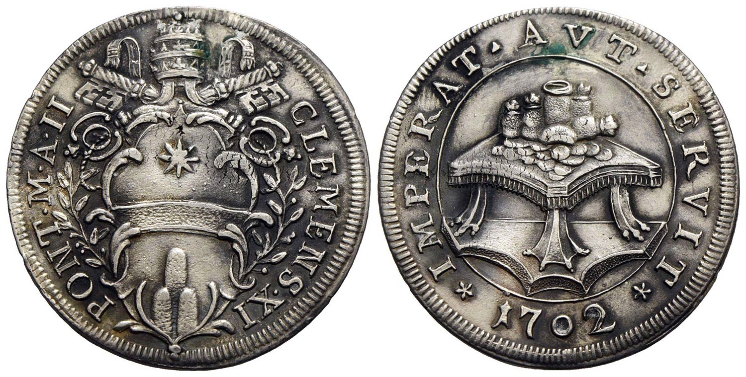 ROMA - Clemente XI (1700-1721) - Testone - 1702 A. II - Stemma sormontato da tiara e chiavi decussate - R/ Tavolo con sacchetti di monete - (AG g. 9,13) R CNI 25; Munt. 67