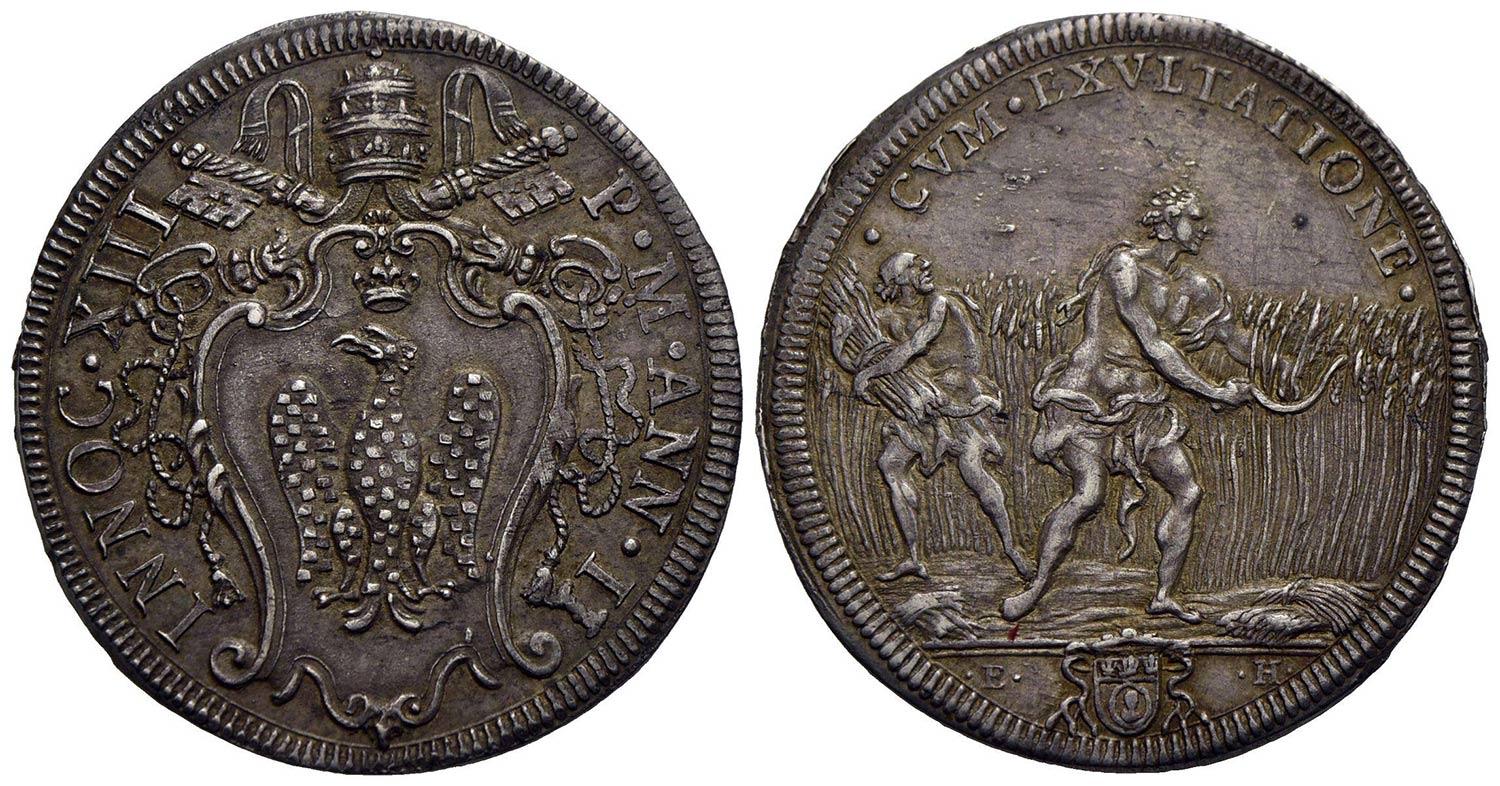 ROMA - Innocenzo XIII (1721-1724) - Mezza piastra - A. I - Stemma a targa sagomata - R/ Due mietitori - (AG g. 16,12) RRR CNI 8; Munt. 4 Delicata patina