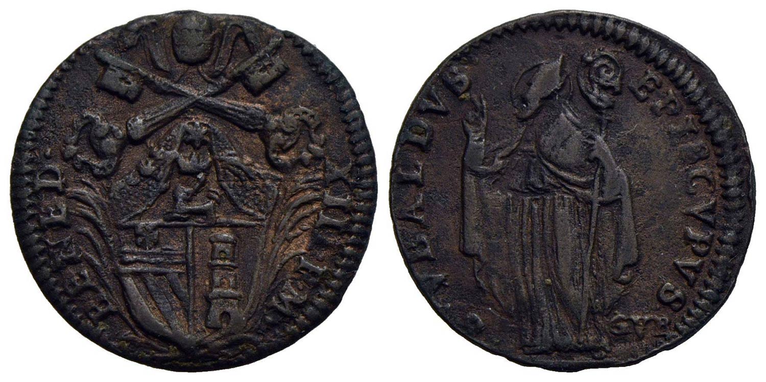 GUBBIO - Benedetto XIII (1724-1730) - Quattrino - Stemma oblungo - R/ Sant'Ubaldo - (CU g. 2,53) RRRR CNI manca; Munt. 75 var. I Il Muntoni lo mette INEDITO