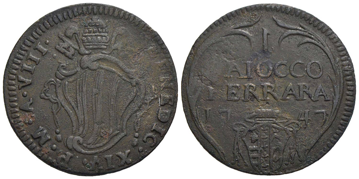 FERRARA - Benedetto XIV (1740-1758) - Baiocco - 1747 A. VIII - Stemma - R/ Scritta su tre righe - (CU g. 10,09) R CNI 85; Munt. 247a