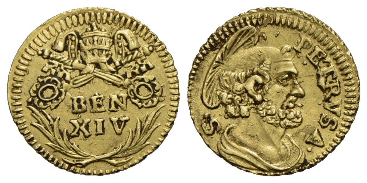 ROMA - Benedetto XIV (1740-1758) - Mezzo scudo d'oro - BEN XIV entro rami di palma - R/ Busto di San Pietro a d. - (AU g. 0,96) CNI 355; Munt. 40