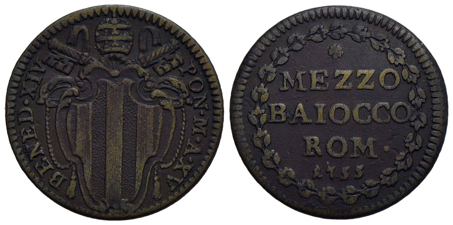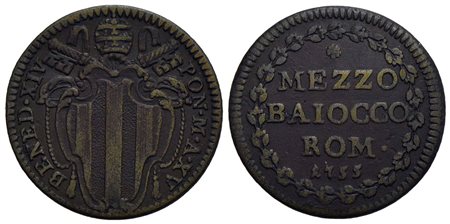 ROMA - Benedetto XIV (1740-1758) - Mezzo baiocco - 1755 A. XV - Stemma ovale sagomato - R/ Scritta - (CU g. 5,63) CNI 332; Munt. 207