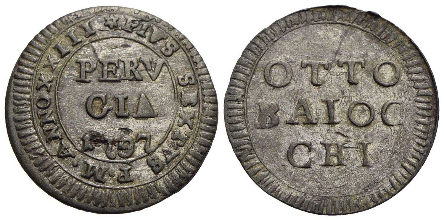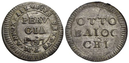 PERUGIA - Pio VI (1775-1799) - Muraiola da 8 baiocchi - 1797 - (MI g. 3,21) R CNI 19; Munt. 385<br>B