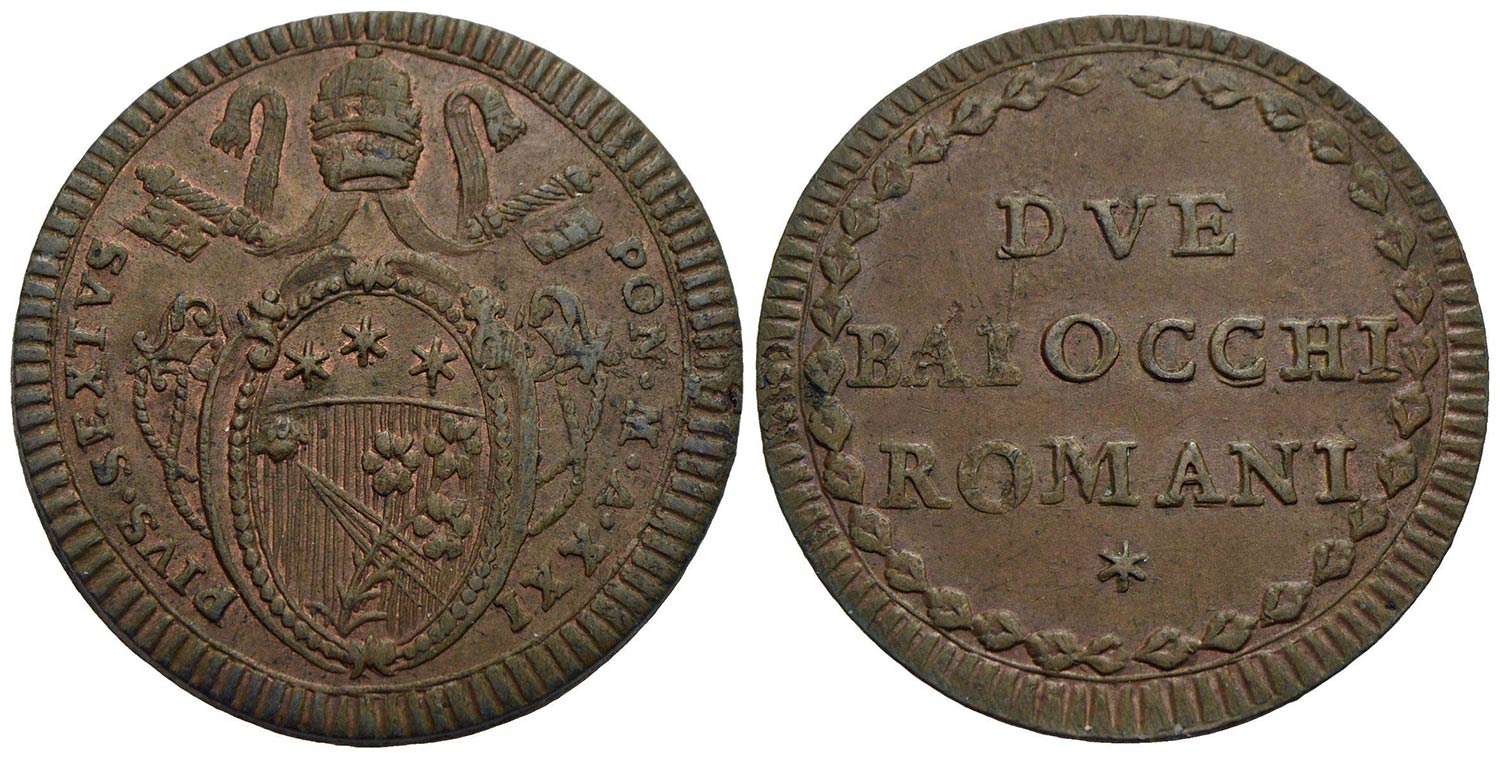ROMA - Pio VI (1775-1799) - 2 Baiocchi - A. XXI - (CU g. 19,66) CNI 301; Munt. 117<br>SPL-FDC<br><br