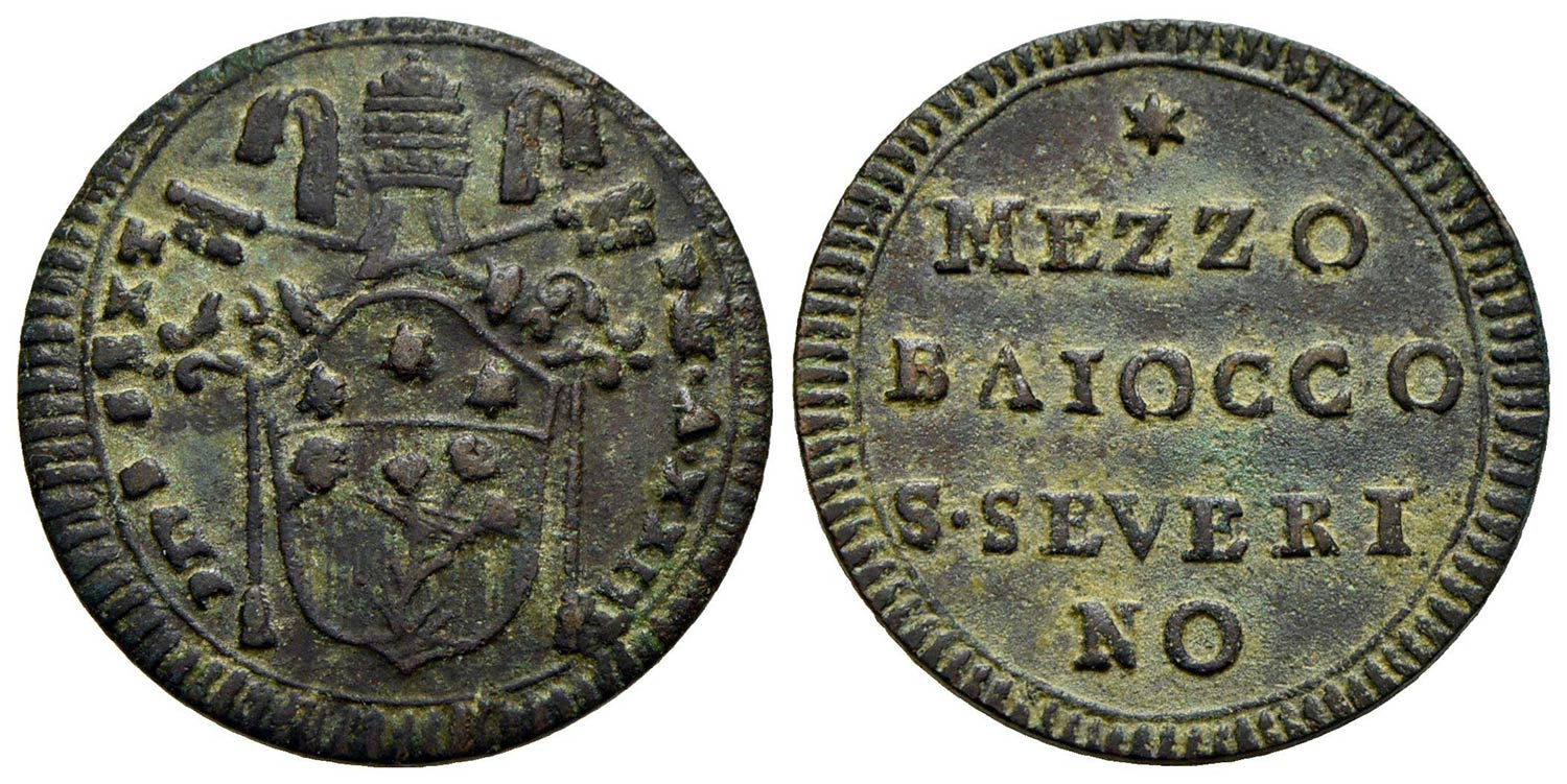 Lotto 727 | SAN SEVERINO - Pio VI (1775-1799) - Mezzo baiocco - A. XXIII - (CU g. 4,25) R CNI 40; Munt. 411a Man