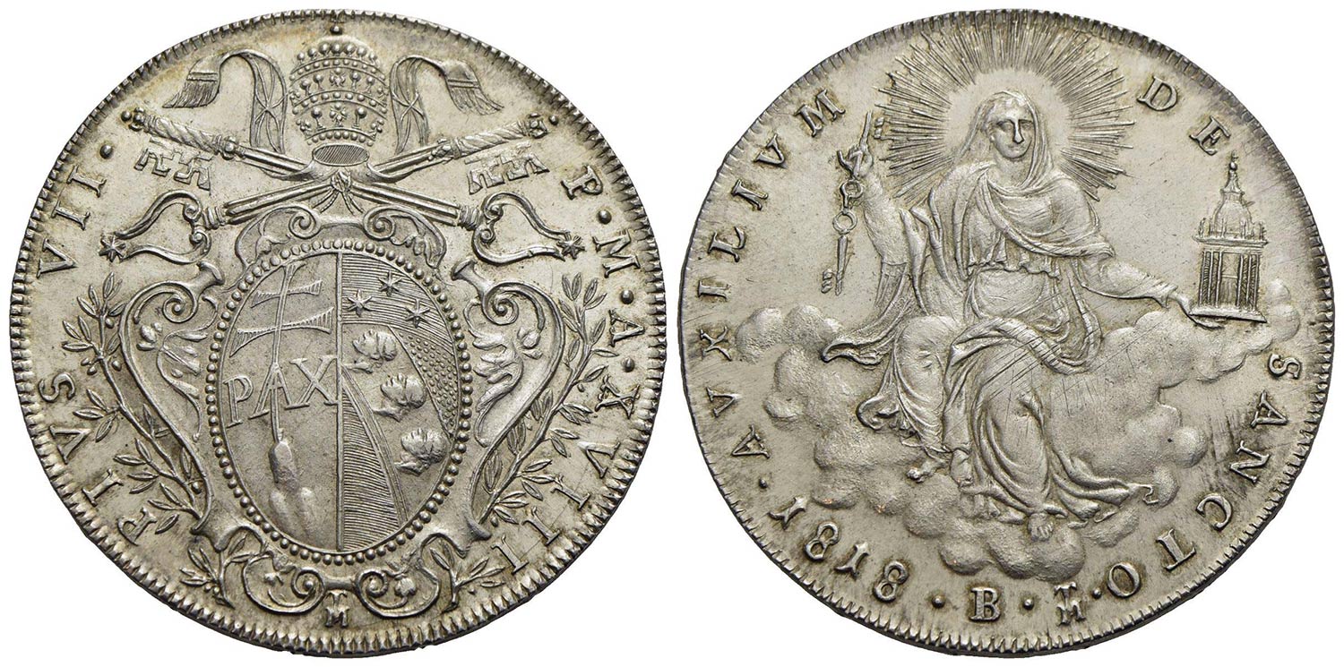 BOLOGNA - Pio VII (1800-1823) - Scudo - 1818 A. XVIII - (AG g. 26,46) R Pag. 87/87b; Mont. 98/100 Graffi di conio al R/ - Eccezionale con i fondi lucenti