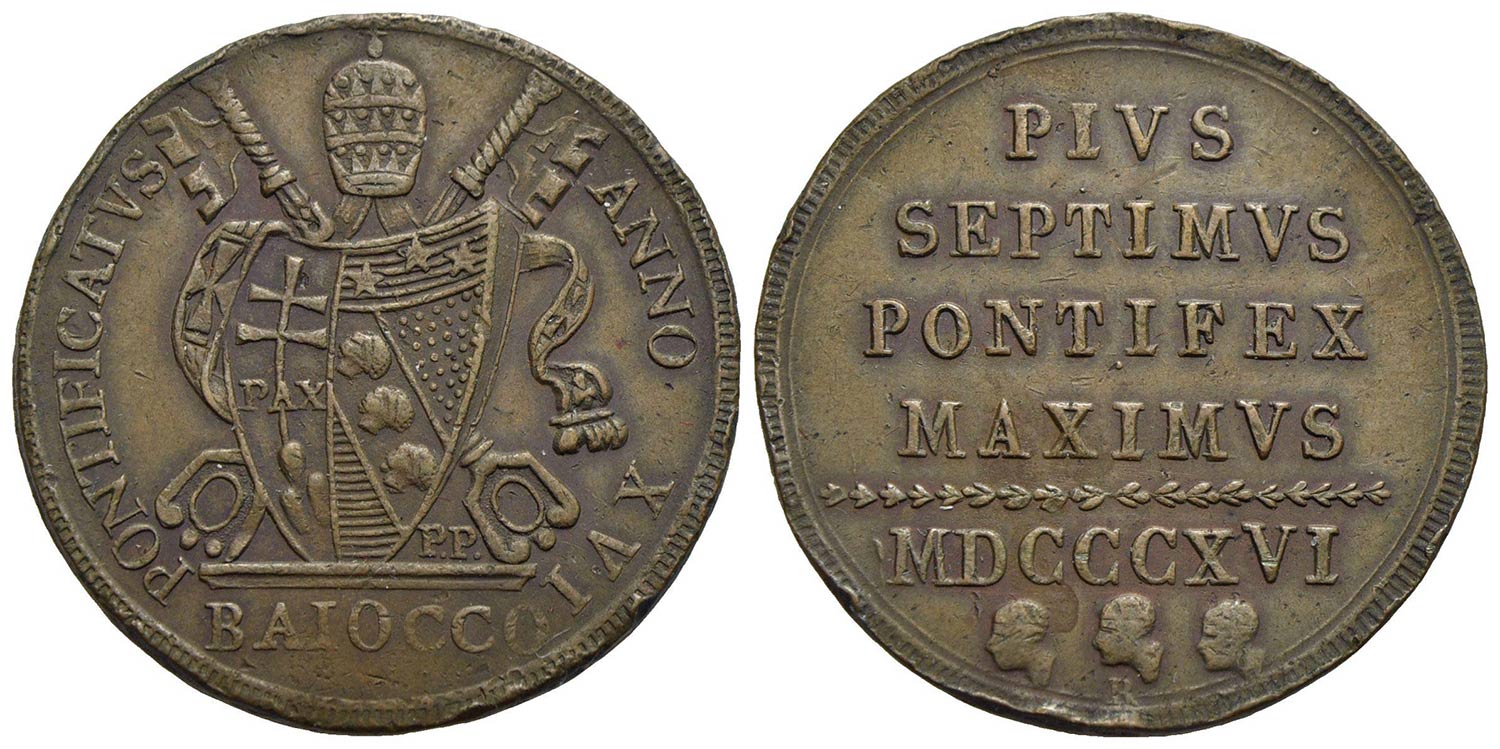 ROMA - Pio VII (1800-1823) - Baiocco - 1816 A. XVI - (CU g. 11,74) RR Pag. 111b; Mont. 121 Colpetti