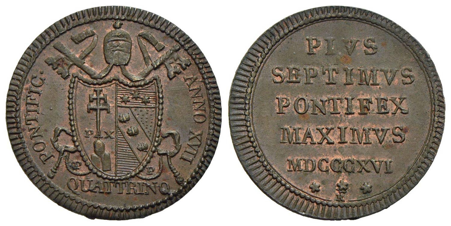 ROMA - Pio VII (1800-1823) - Quattrino - 1816 A. XVII - (CU g. 2,43) Pag. 119; Mont. 139 Rame rosso<