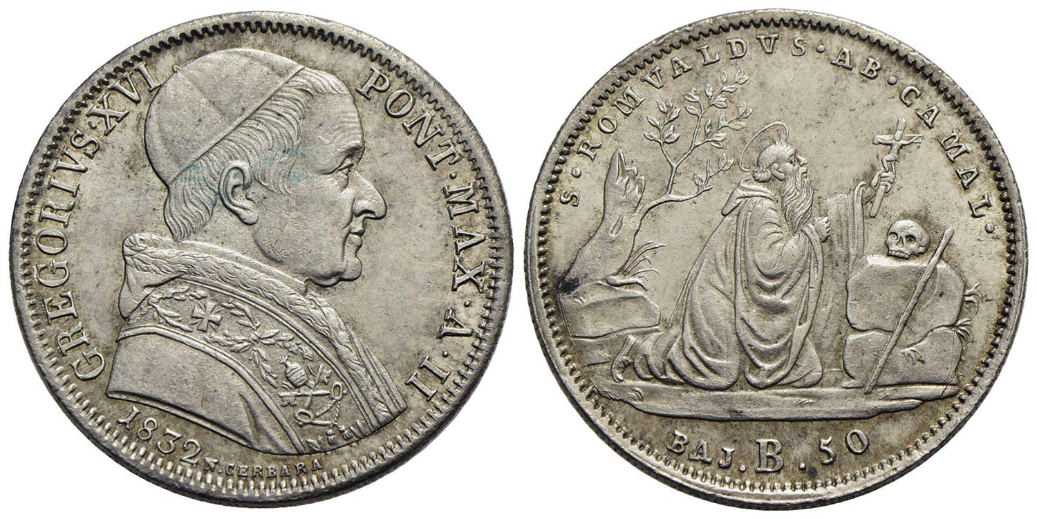 BOLOGNA - Gregorio XVI (1831-1846) - 50 Baiocchi - 1832 A. II - (AG g. 13,21) R Pag. 158; Mont. 93<b