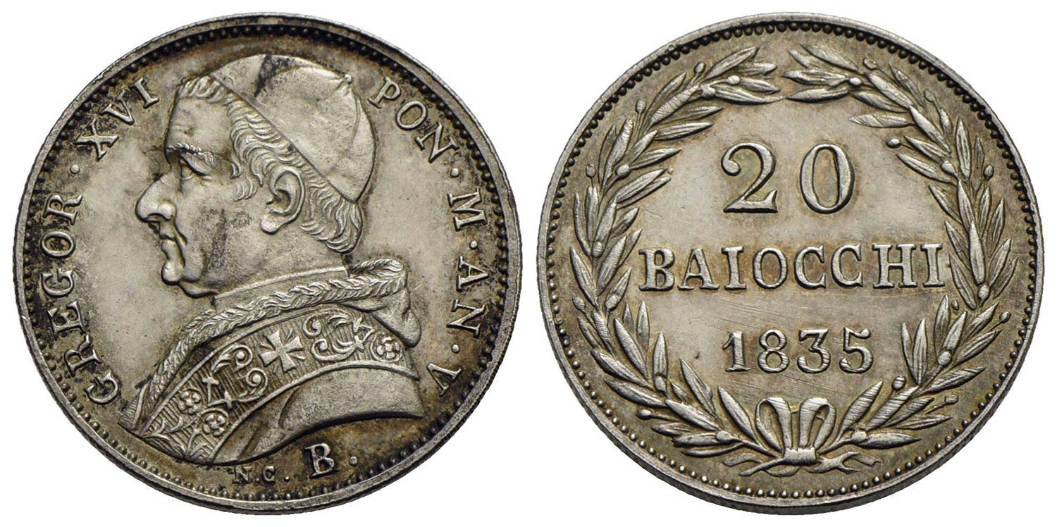 Lotto 763 | BOLOGNA - Gregorio XVI (1831-1846) - 20 Baiocchi - 1835 A. V - (AG g. 5,42) R Pag. 166; Mont. 116<br