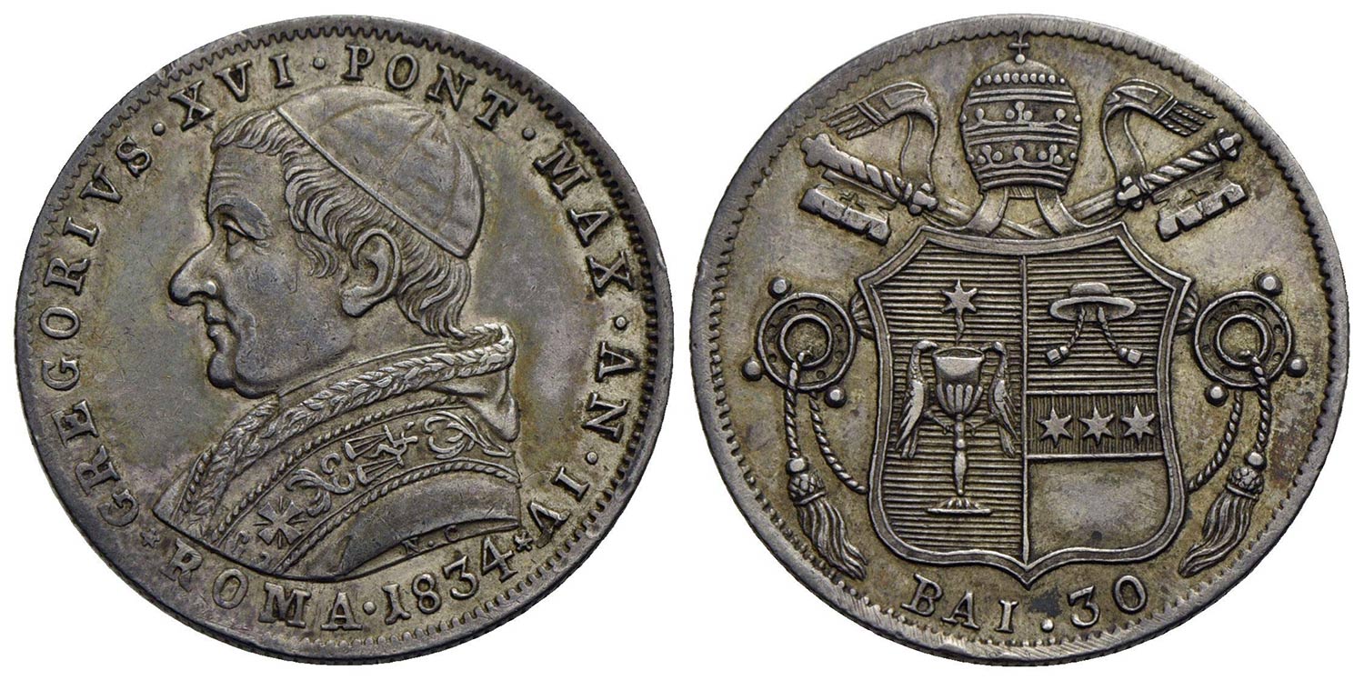 Lotto 772 | ROMA - Gregorio XVI (1831-1846) - 30 Baiocchi - 1834 A. IV - (AG g. 7,96) Pag. 225; Mont. 106<br>BB-