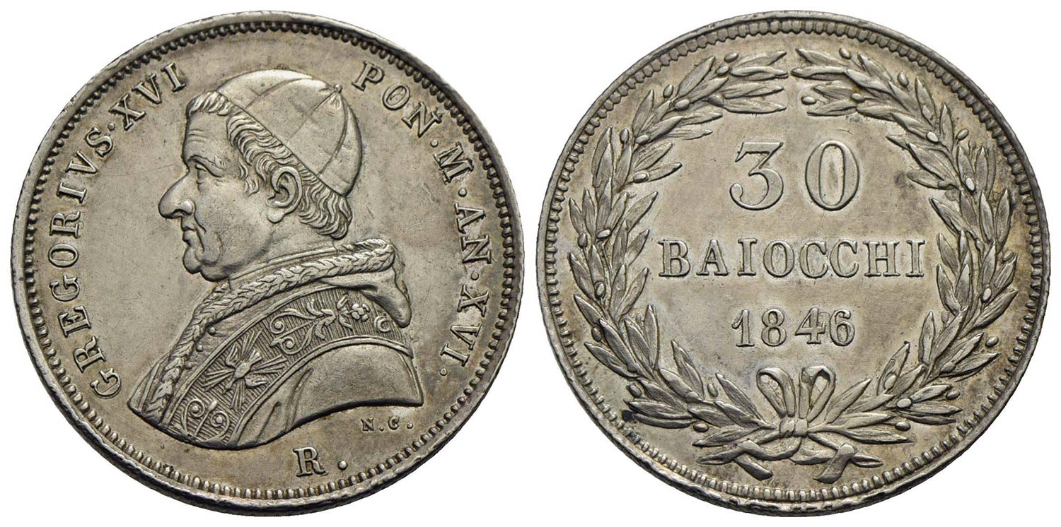 ROMA - Gregorio XVI (1831-1846) - 30 Baiocchi - 1846 A. XVI - (AG g. 8,06) R Pag. 229a; Mont. 113