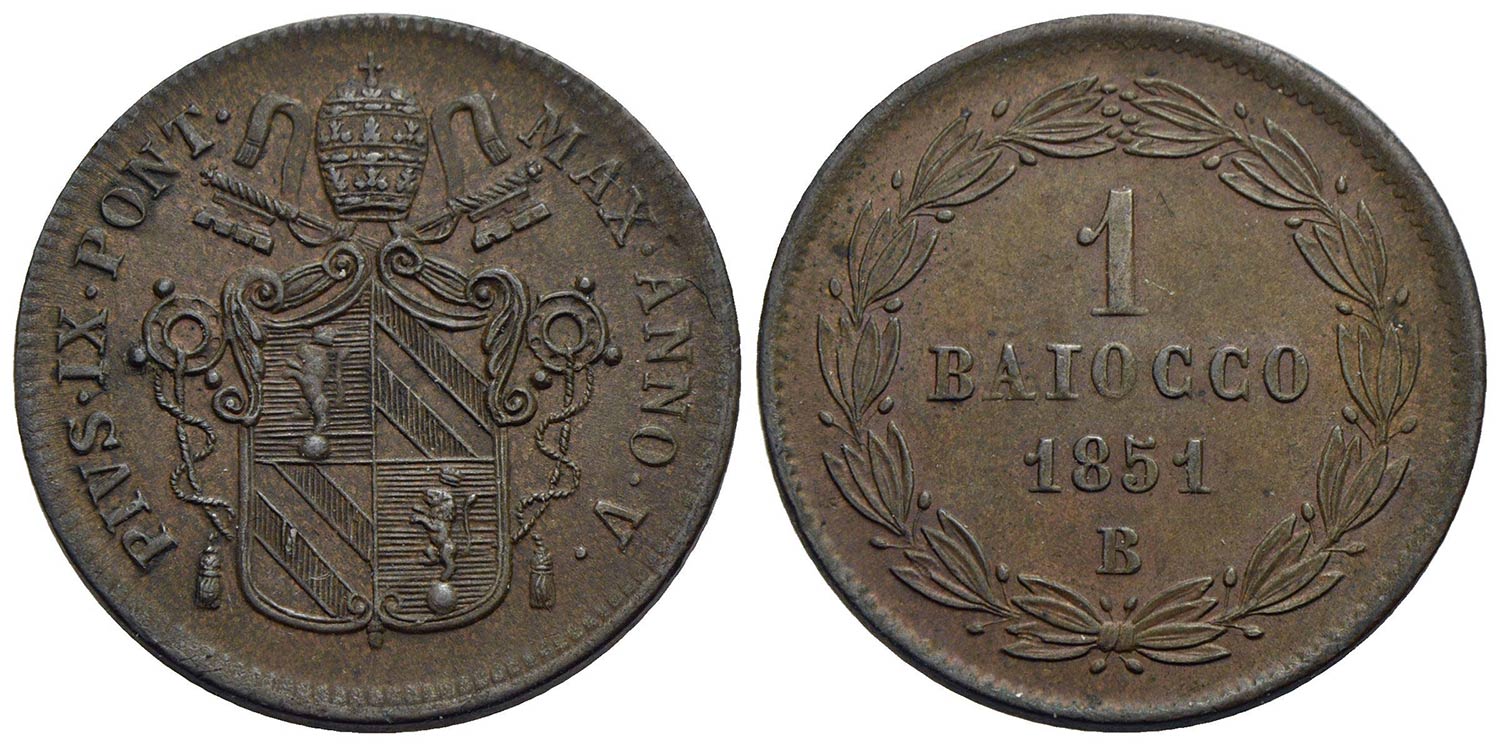 BOLOGNA - Pio IX (1846-1866) - Baiocco - 1851 A. V - (CU g. 10) Pag. 320; Mont. 307<br>SPL+<br><br>C