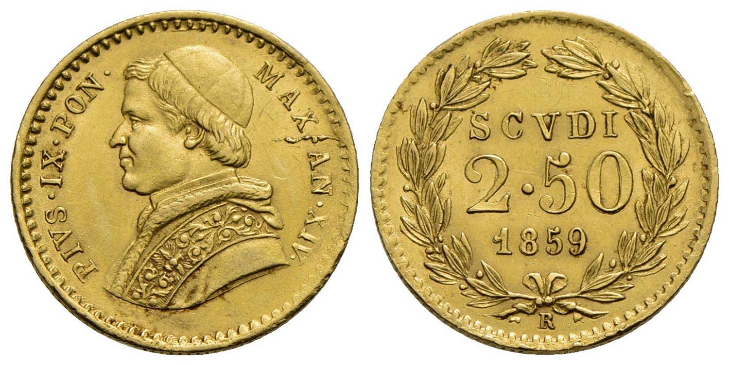 Lotto 783 | ROMA - Pio IX (1846-1866) - 2,50 Scudi - 1859 A. XIV - (AU g. 4,36) Pag. 368; Mont. 99<br>qFDC<br><b