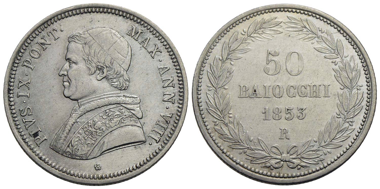 Lotto 786 | ROMA - Pio IX (1846-1866) - 50 Baiocchi - 1853 A. VIII - (AG g. 13,41) Pag. 402; Mont. 136 Pulita<br