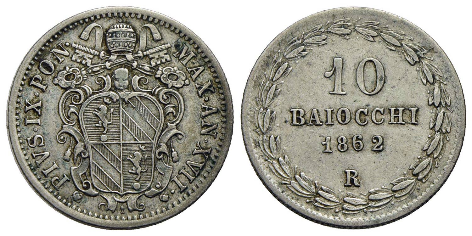 Lotto 791 | ROMA - Pio IX (1846-1866) - 10 Baiocchi - 1862 A. XVII - (AG g. 2,8) Pag. 445; Mont. 200<br>BB+<br><