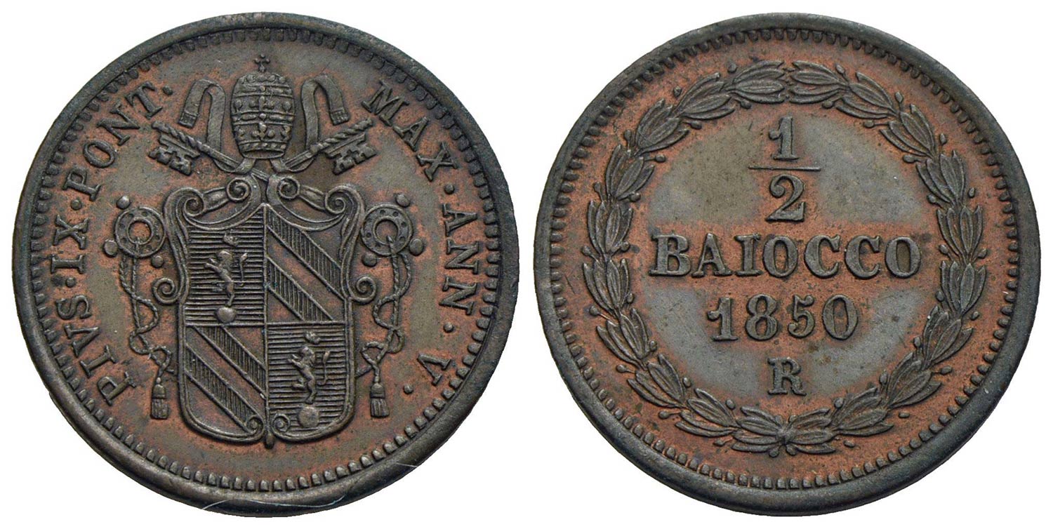 ROMA - Pio IX (1846-1866) - Mezzo baiocco - 1850 A. V - (CU g. 5) Pag. 512a; Mont. 324 Rame rosso<br