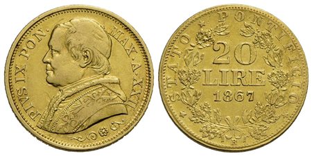 ROMA - Pio IX (1866-1878) - 20 Lire - 1867 A. XXII - (AU g. 6,44) Pag. 531; Mont. 347<br>BB+<br><br>