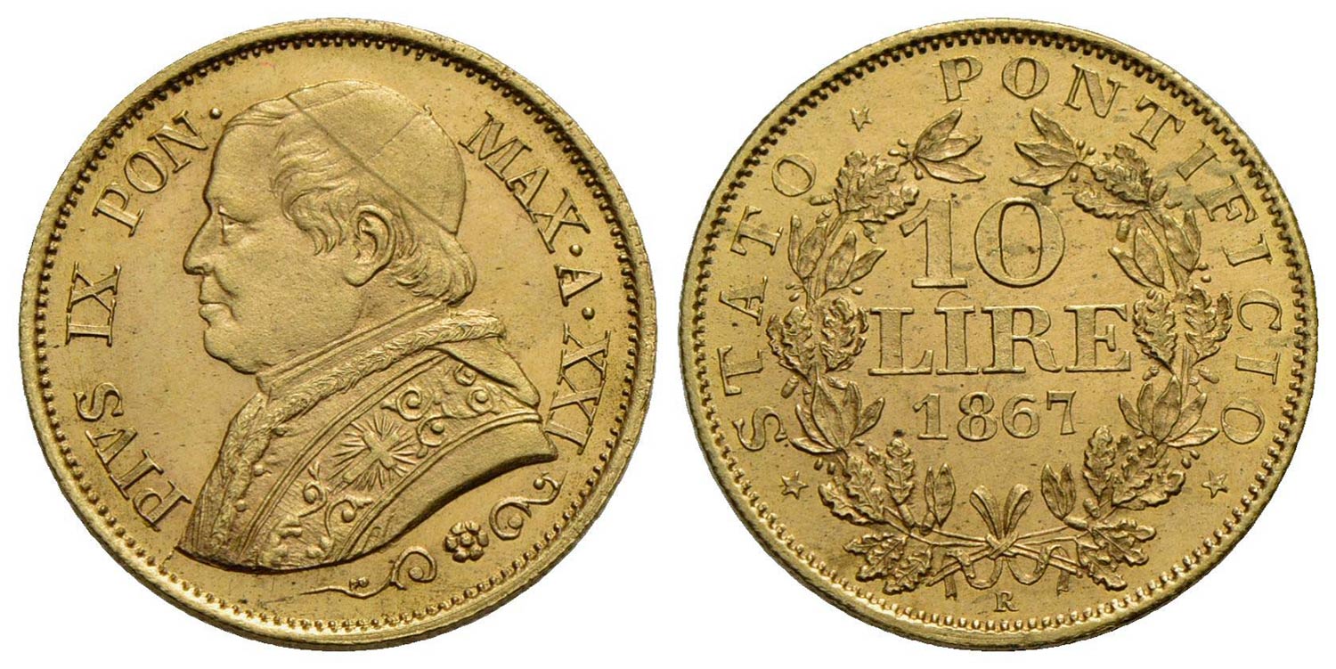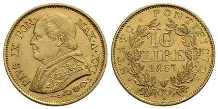 ROMA - Pio IX (1866-1878) - 10 Lire - 1867 A. XXI - (AU g. 3,23) RR Pag. 541; Mont. 356 Fondi lucent