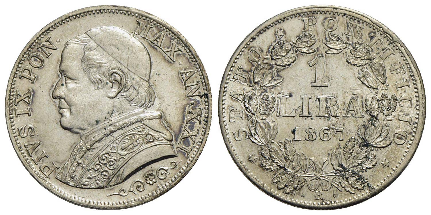 ROMA - Pio IX (1866-1878) - Lira - 1867 A. XXI - (AG g. 5) Pag. 569; Mont. 379<br>SPL-FDC<br><br>Con