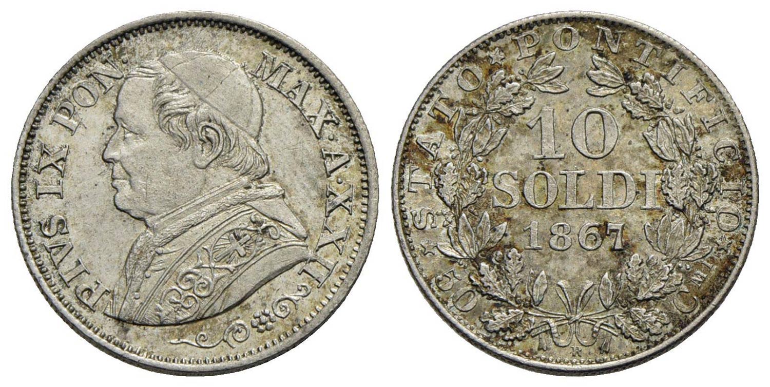 ROMA - Pio IX (1866-1878) - 10 Soldi - 1867 A. XXII - (AG g. 2,5) Pag. 579; Mont. 388