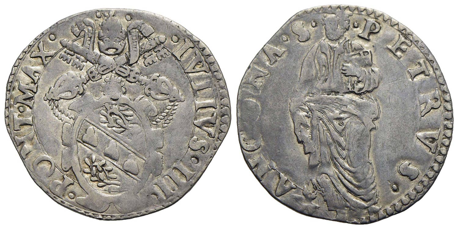 ANCONA - Giulio III (1550-1555) - Giulio - Stemma sormontato da tiara e chiavi decussate - R/ San Pietro stante con chiavi nella d. in basso e libro contro il petto - (AG g. 2,89) CNI 14; Munt. 54