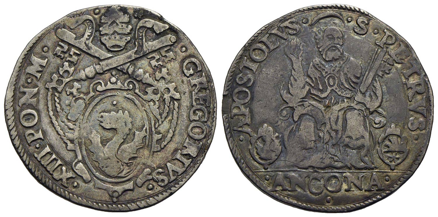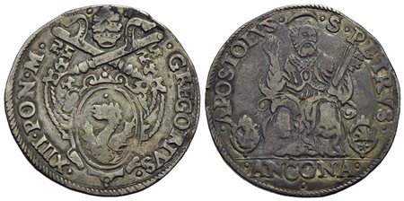 ANCONA - Gregorio XIII (1572-1585) - Testone - Stemma - R/ Figura del Santo seduto - (AG g. 9,43) CNI 195 Con cartellino del collezionista anni '50-'60