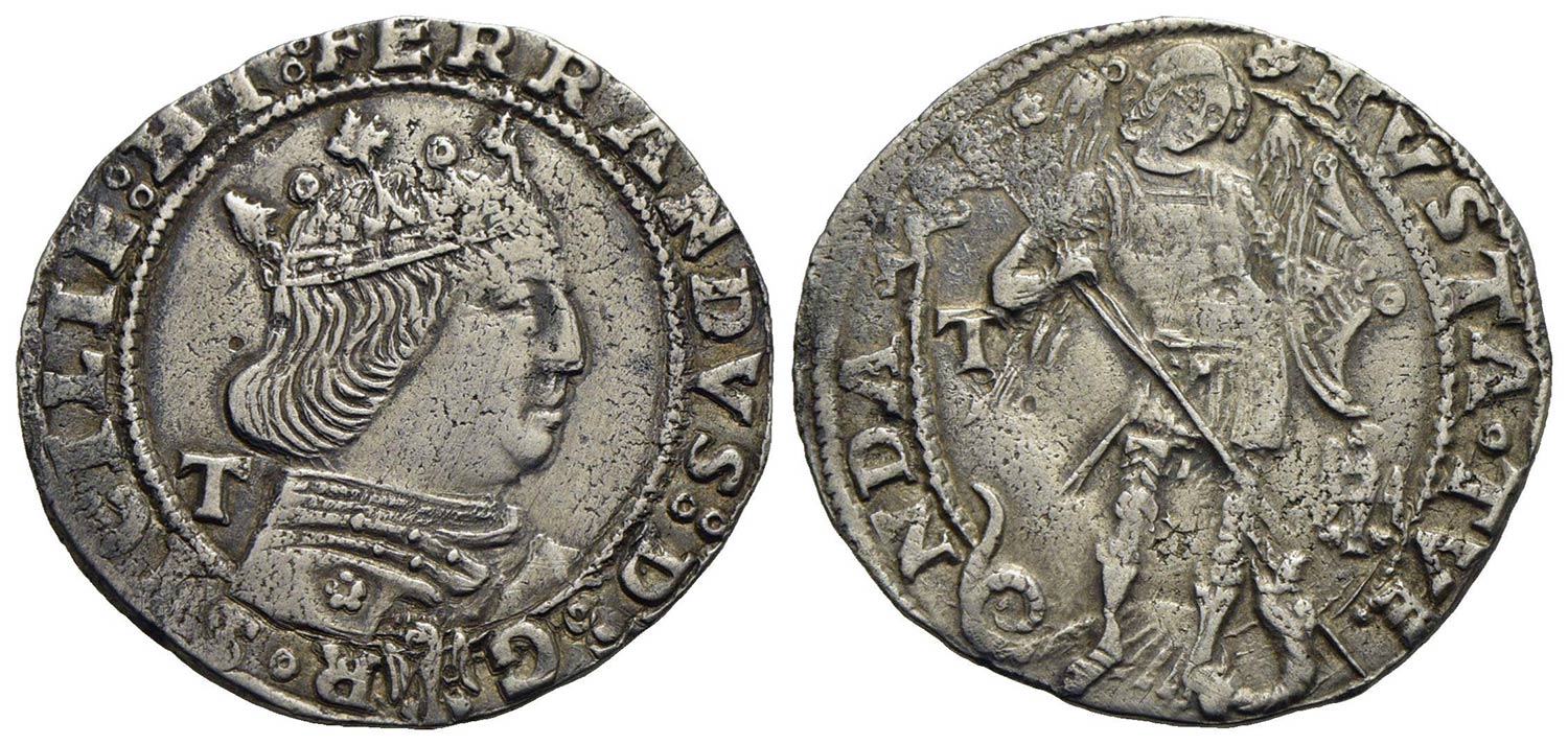 L'AQUILA - Ferdinando I d’Aragona (1458-1494) - Coronato - Busto coronato a d.; dietro T - R/ L'Arcangelo Michele uccide il drago, nel campo a d. un'aquila - (AG g. 3,94) R CNI 2/58; MIR 90