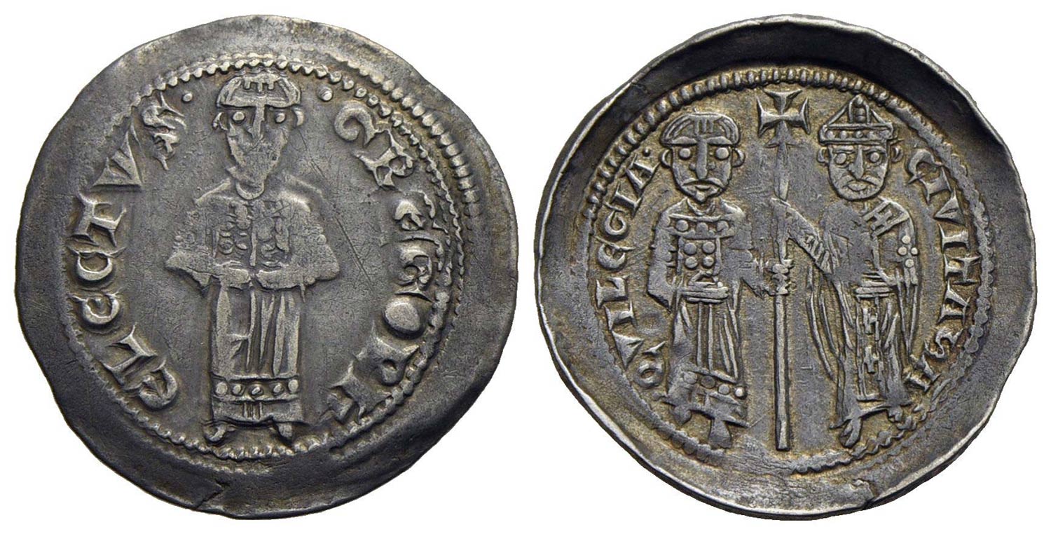 AQUILEIA - Gregorio di Montelongo (1251-1269) - Denaro - Il patriarca stante - R/ San Gregorio e Sant'Ermagora stanti - (AG g. 1,24) RRR Ber. 18; Biaggi 145
