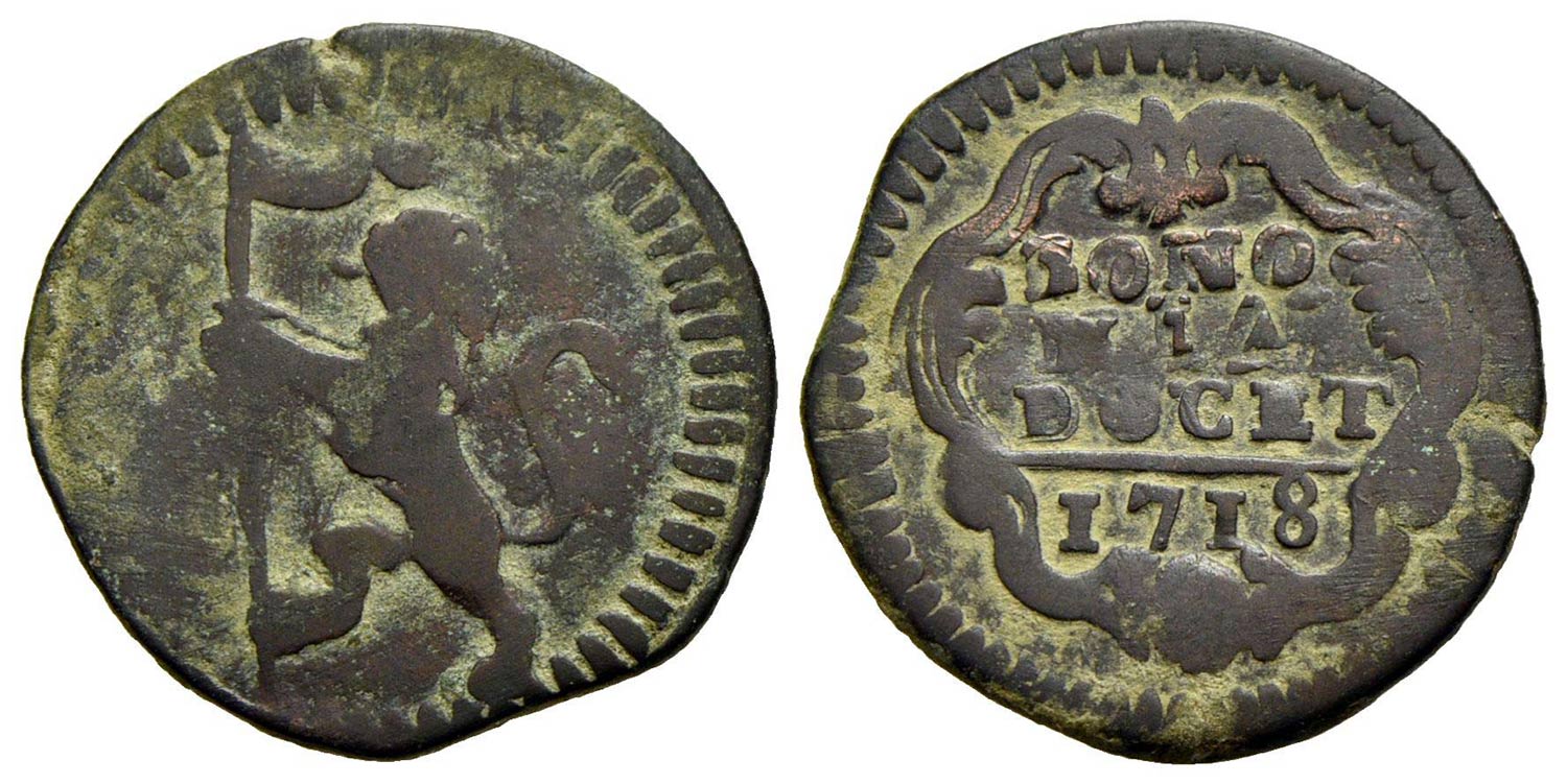 BOLOGNA - Clemente XI (1700-1721) - Quattrino - 1718 - Leone vessilifero a s. - R/ Scritta entro car