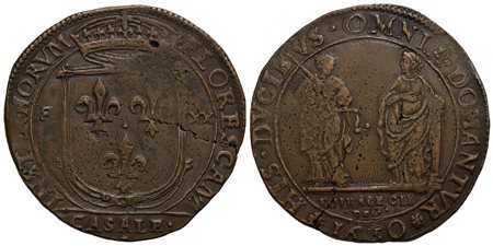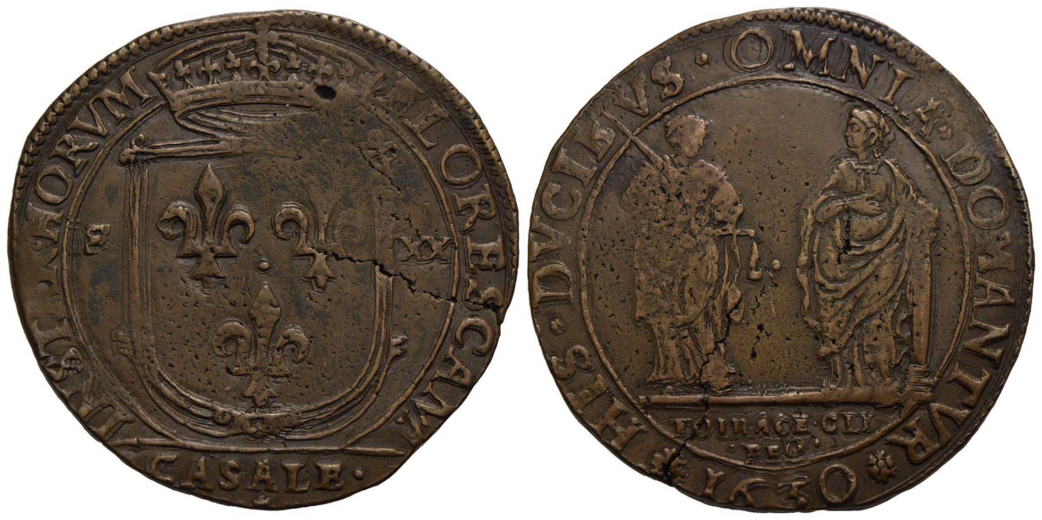 CASALE - Assedio Austro-Spagnolo (1629-1630) - 20 Fiorini - 1630 - Stemma coronato - R/ La Giustizia e la Forza stanti - (CU g. 20,17) RRR CNI 2; MIR 354 Coniato dalla guarnigione francese durante l'assedio delle truppe spagnole e austriache nella guerra di successione mantovana Frattura marginale e punto di pressione - Porosità - Molto raro