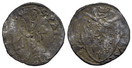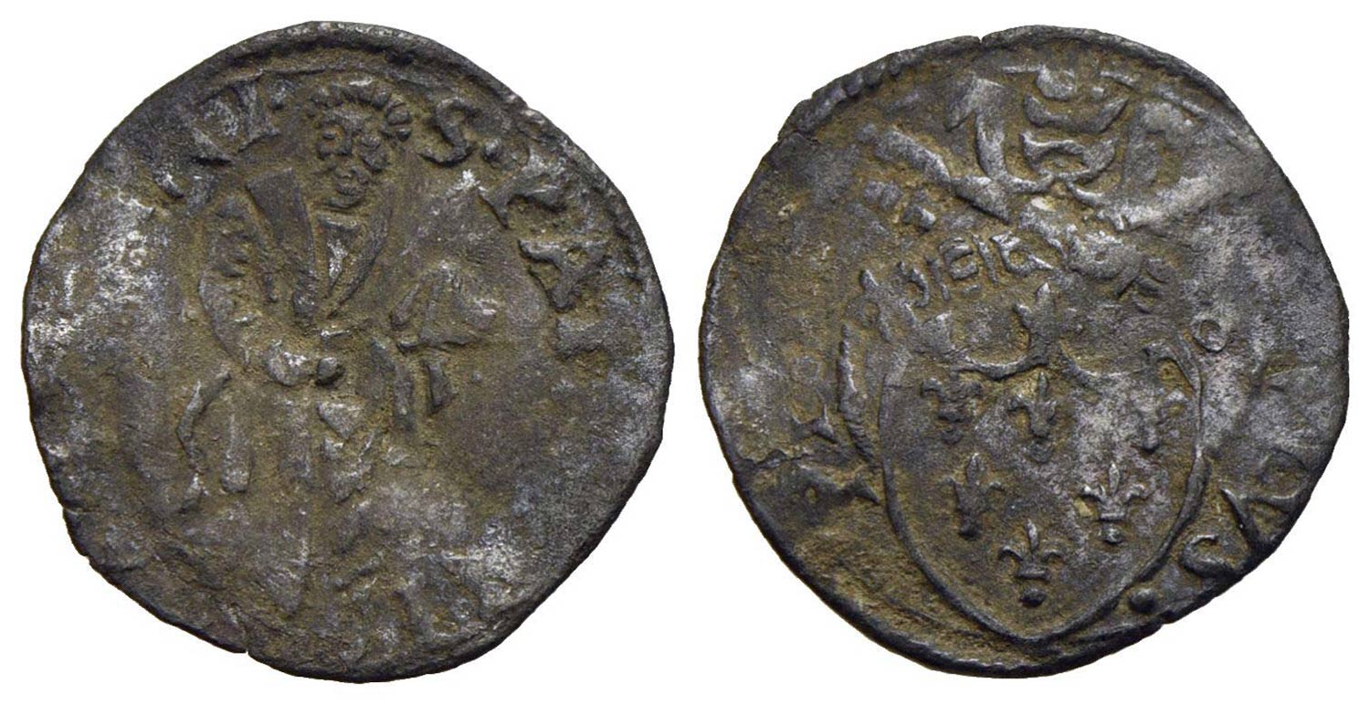 FANO - Paolo III (1534-1549) - Quattrino - Stemma semiovale gigliato - R/ Figura del Santo con mitra nella s. - (MI g. 0,58) R CNI 1; Munt. 130 Con cartellino del collezionista anni '50-'60