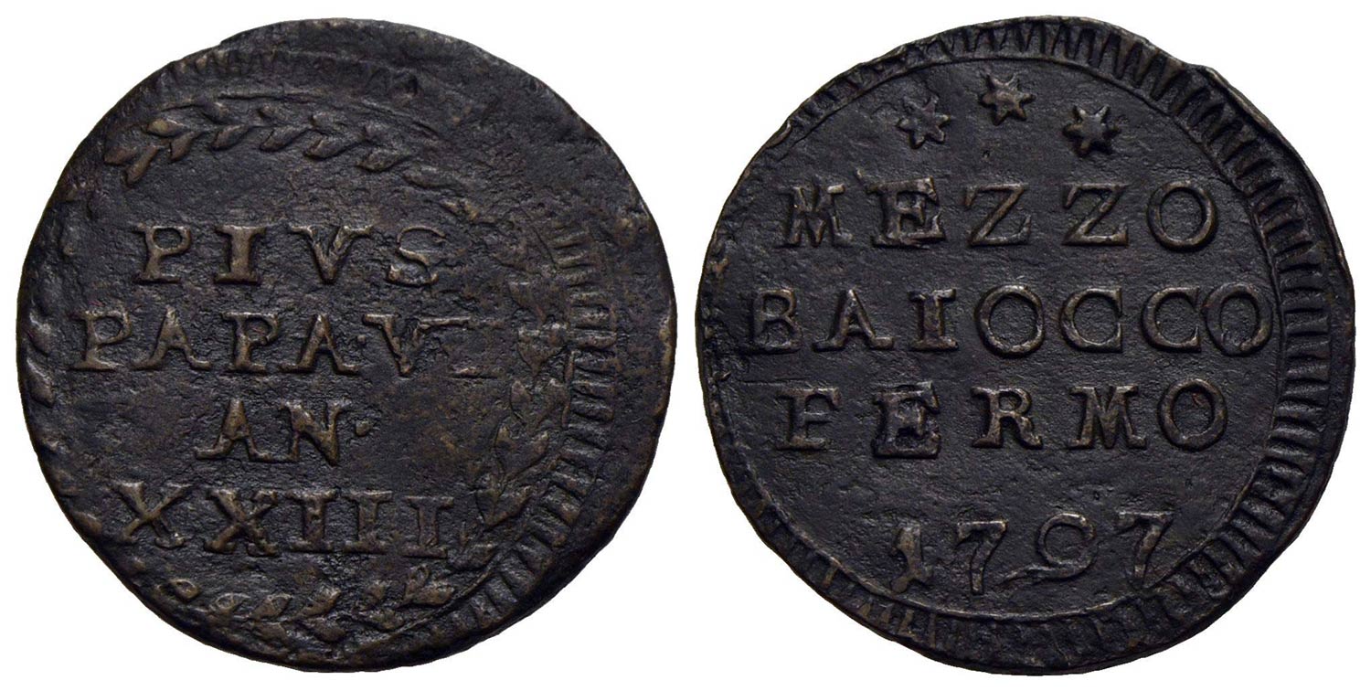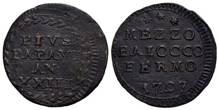 FERMO - Pio VI (1775-1799) - Mezzo baiocco - 1797 A. XXIII - CU R CNI 26; Munt. 324<br>BB/BB+