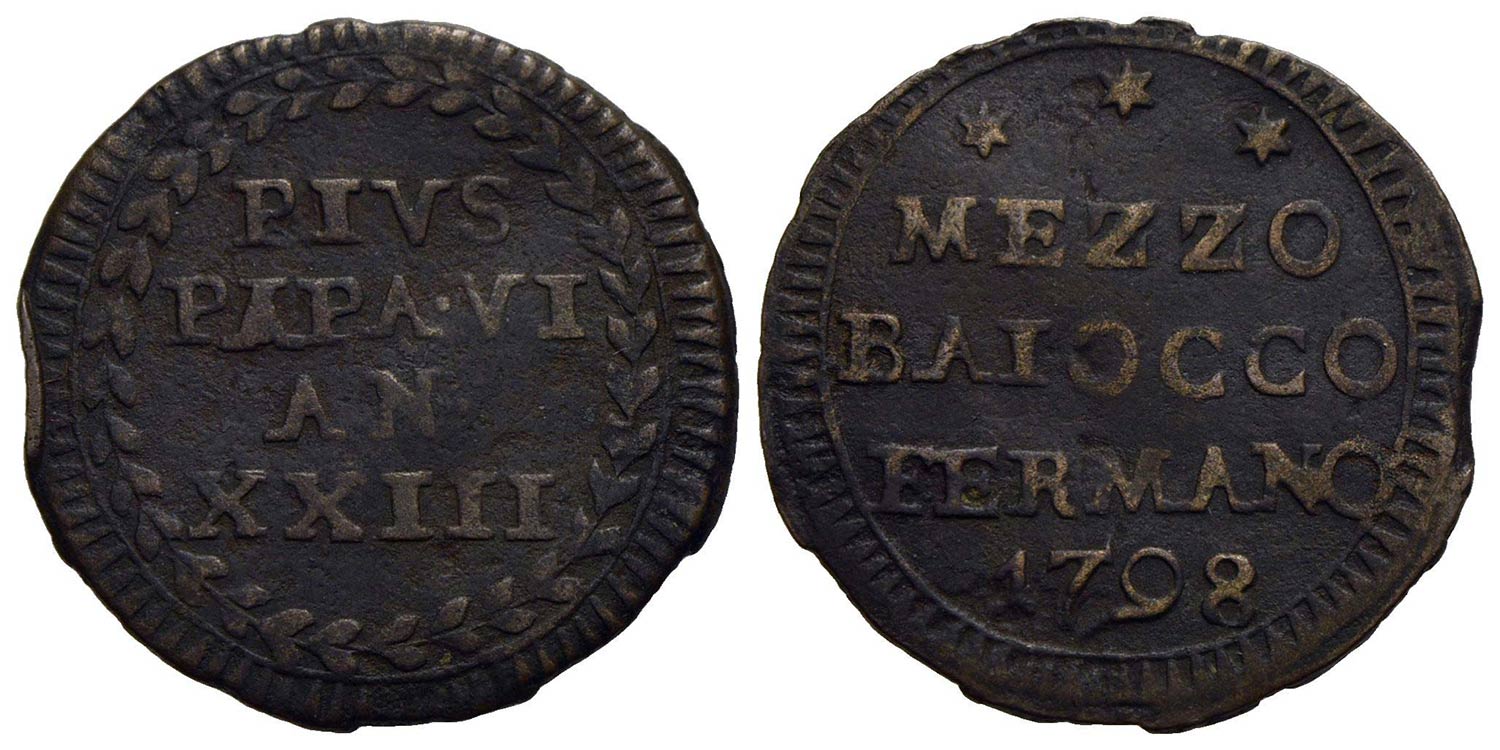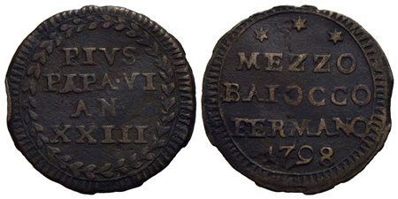 FERMO - Pio VI (1775-1799) - Mezzo baiocco - 1798 A. XXIII - CU RR CNI 31; Munt. 325<br>BB+