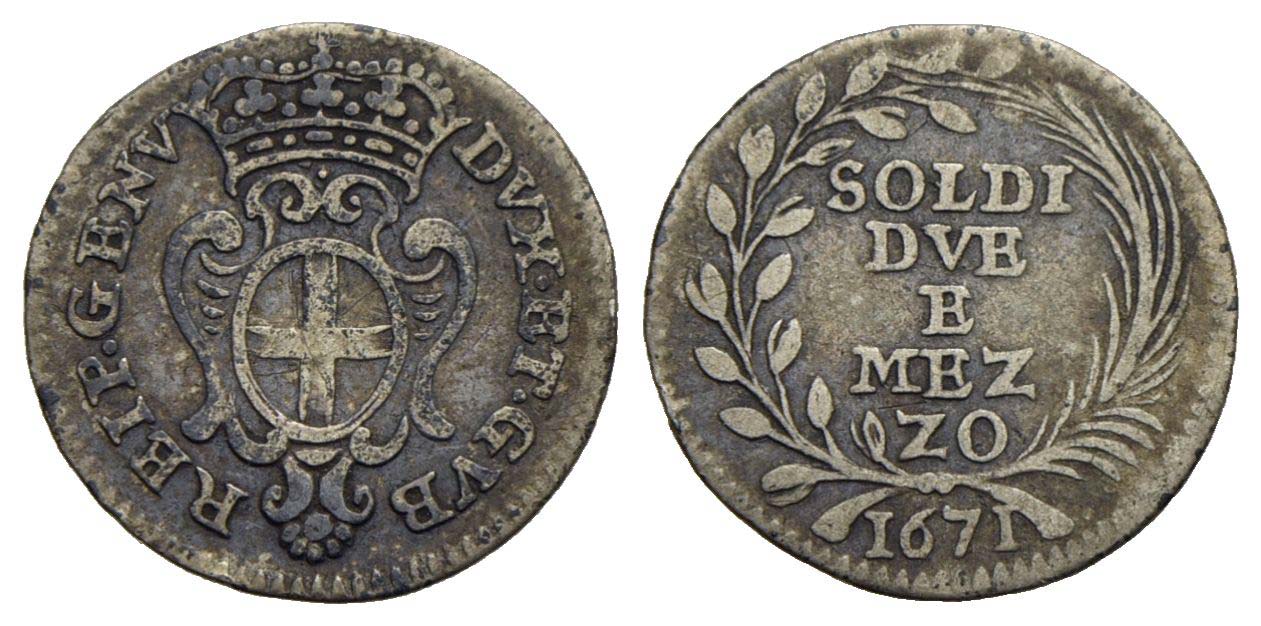 Lotto 1056 | GENOVA - Dogi Biennali (terza fase, 1637-1797) - 2,5 Soldi - 1671 - Stemma coronato - R/ Scritta - A