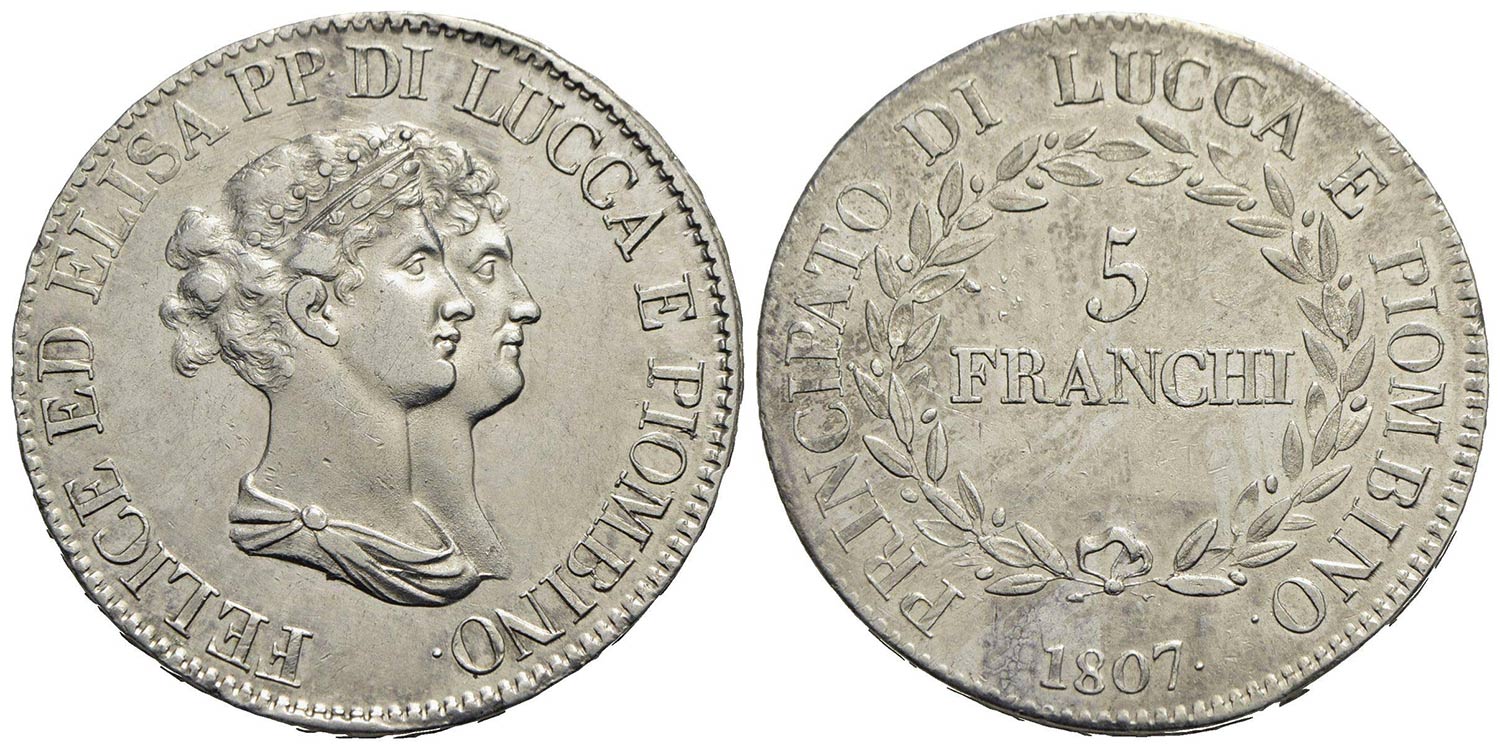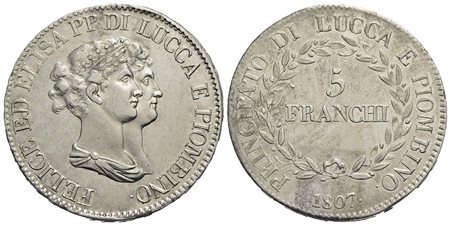 LUCCA - Elisa Bonaparte e Felice Baciocchi (1805-1814) - 5 Franchi - 1807 - AG R Pag. 253; Mont. 437