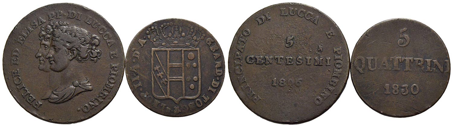 LUCCA - Elisa Bonaparte e Felice Baciocchi (1805-1814) - 5 Centesimi - 1806 - CU R Pag. 259; Mont. 444 assieme a 5 quattr. 1830 - Lotto di due monete
