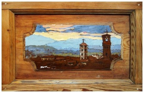 MASSIMO LOMI (Livorno 1953) Lucca al tramonto 2012 Olio su tavola 42 x 66 x 5. Firma in b. a s.; sul verso etichetta e timbro studio dell’artista. Autentica dell’autore su foto in esecuzione.
