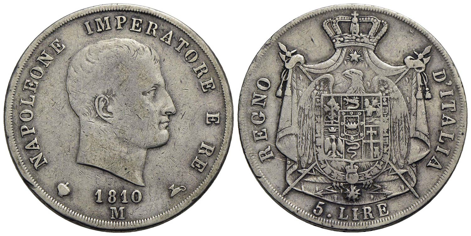 MILANO - Napoleone I, Re d'Italia (1805-1814) - 5 Lire - 1810 - AG RR Pag. 28a; Mont. 223 Puntali aguzzi Al D/ cifre 10 su 0 - Scritta sul contorno in incuso